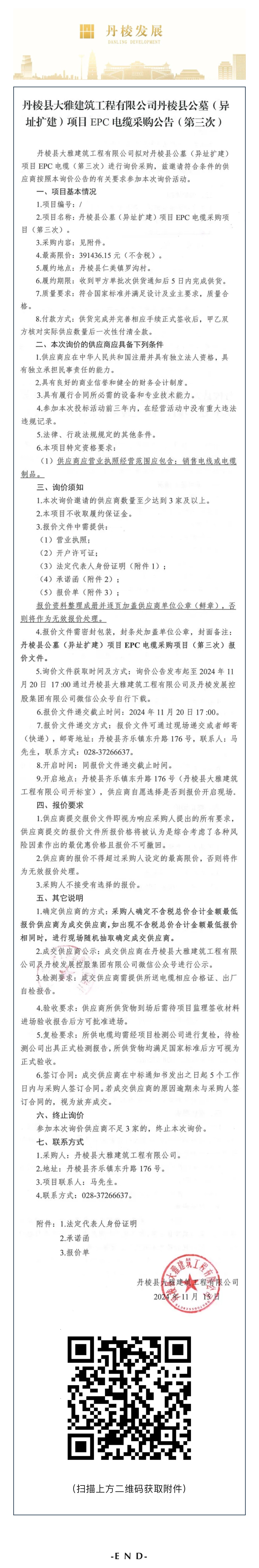 丹棱縣大雅建筑工程有限公司丹棱縣公墓(異址擴(kuò)建)項(xiàng)目EPC電纜采購(gòu)公告(第三次)