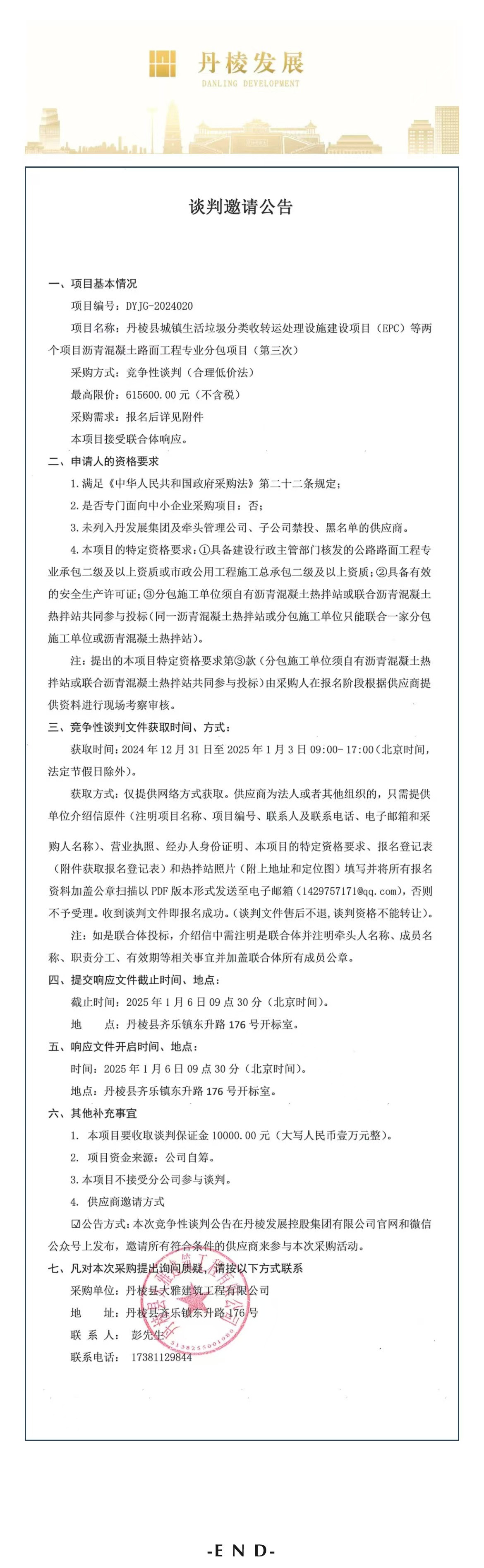 丹棱縣城鎮(zhèn)生活垃圾分類收轉(zhuǎn)運(yùn)處理設(shè)施建設(shè)項(xiàng)目(EPC)等兩個(gè)項(xiàng)目瀝青混凝土路面工程專業(yè)分包項(xiàng)目(第三次)談判邀請公告
