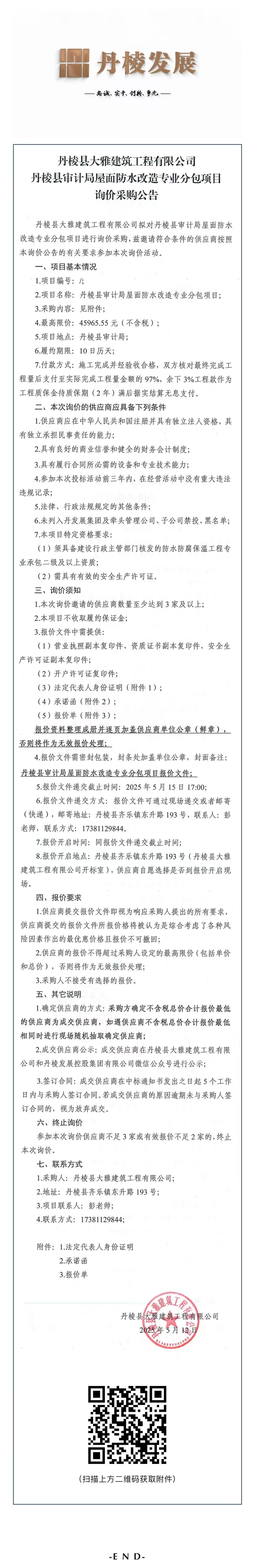 丹棱縣大雅建筑工程有限公司丹棱縣審計(jì)局屋面防水改造專(zhuān)業(yè)分包項(xiàng)目詢價(jià)采購(gòu)公告