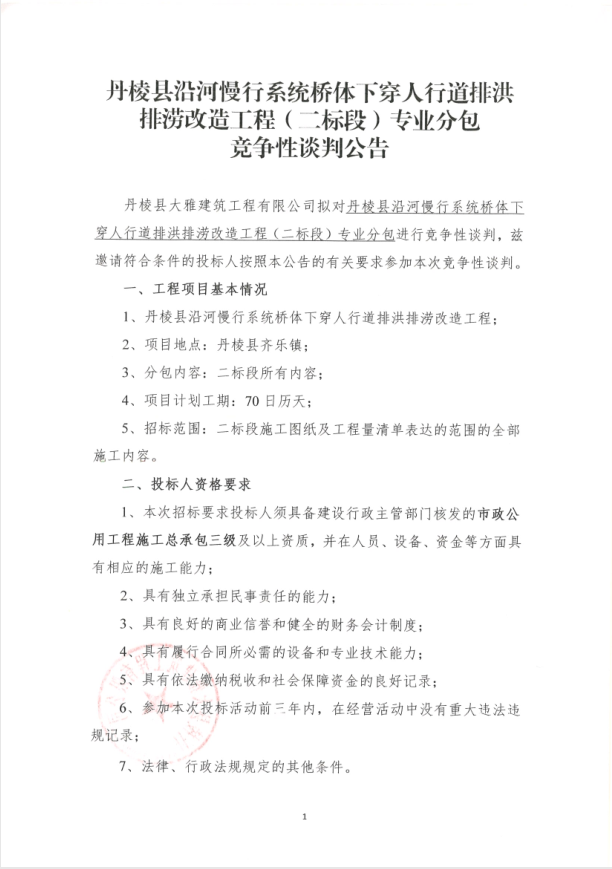 【大雅建筑公司】丹棱縣沿河慢行系統(tǒng)橋體下穿人行道排洪排澇改造工程(二標(biāo)段)專業(yè)分包競(jìng)爭(zhēng)性談判公告