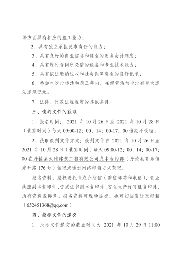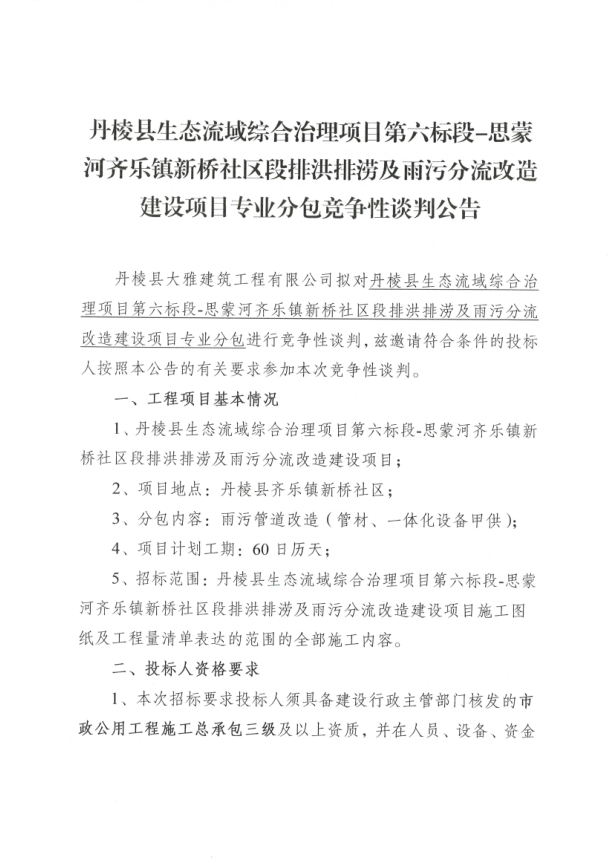 【大雅建筑公司】丹棱縣生態(tài)流域綜合治理項目第六標段-思蒙河齊樂鎮(zhèn)新橋社區(qū)段排洪排澇及雨污分流改造建設(shè)項目專業(yè)分包競爭性談判公告