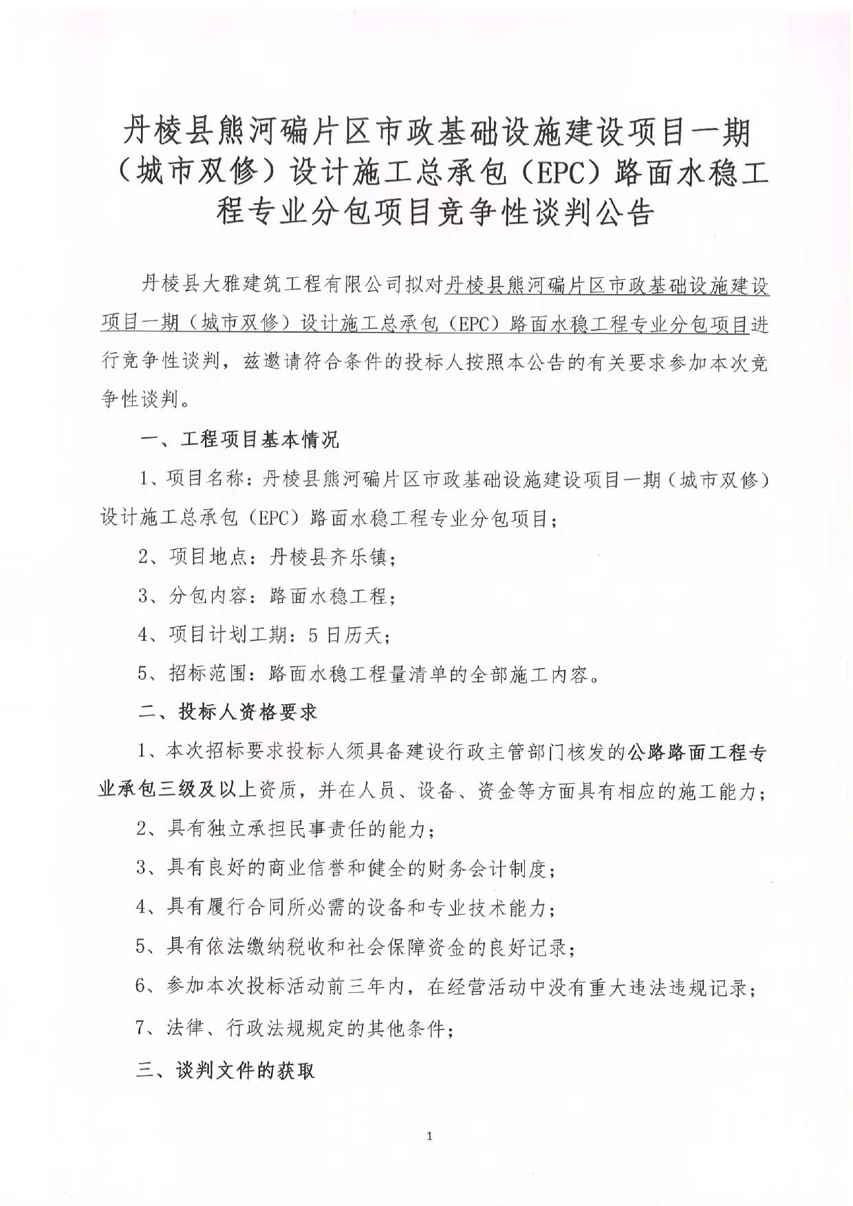 丹棱縣熊河碥片區(qū)市政基礎(chǔ)設(shè)施建設(shè)項(xiàng)目一期(城市雙修)設(shè)計(jì)施工總承包(EPC)路面水穩(wěn)工 程專(zhuān)業(yè)分包項(xiàng)目競(jìng)爭(zhēng)性談判公告