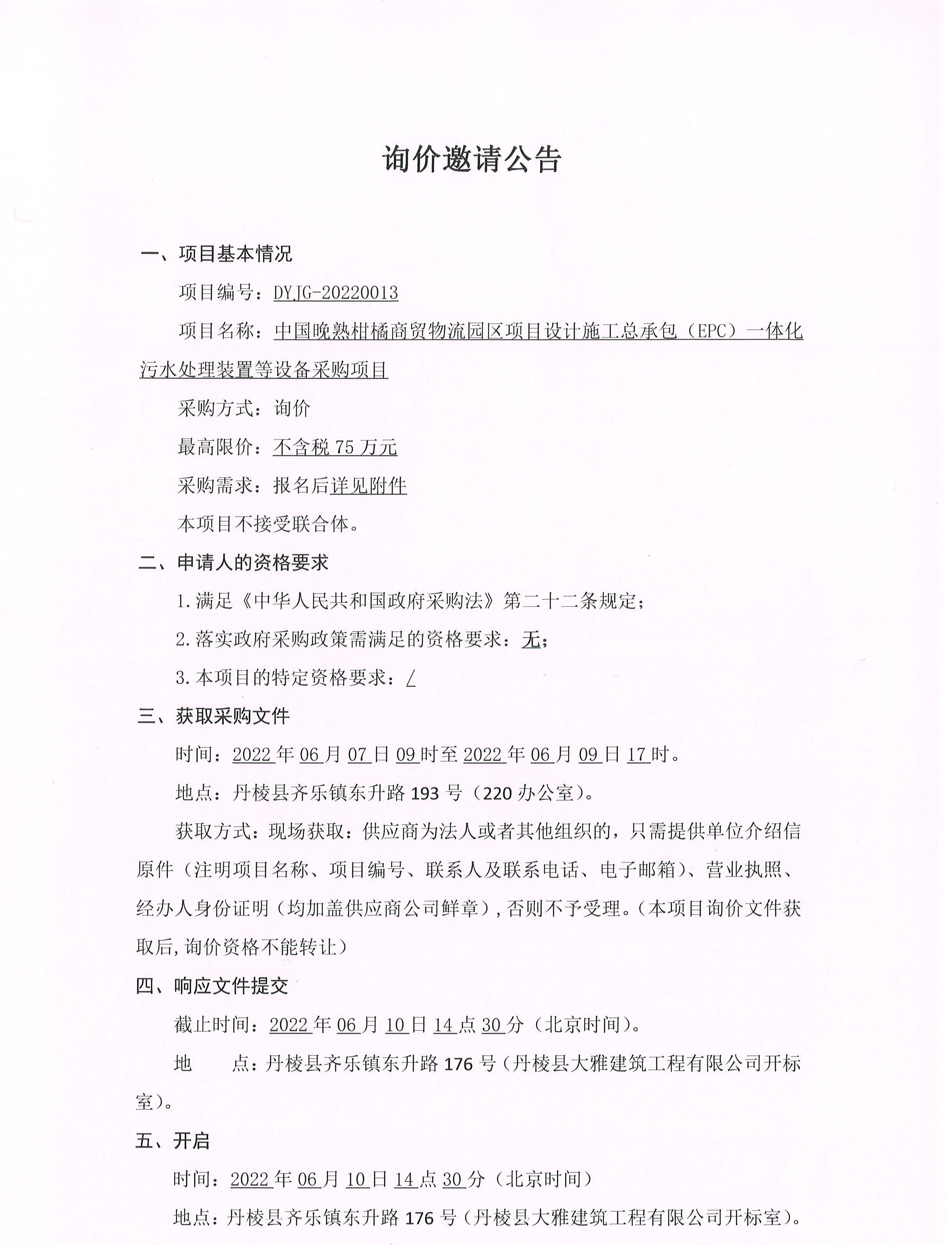 中國(guó)晚熟柑橘商貿(mào)物流園區(qū)項(xiàng)目設(shè)計(jì)施工總承包(EPC) 體化污水處理裝置等設(shè)備采購(gòu)項(xiàng)目詢價(jià)邀請(qǐng)公告