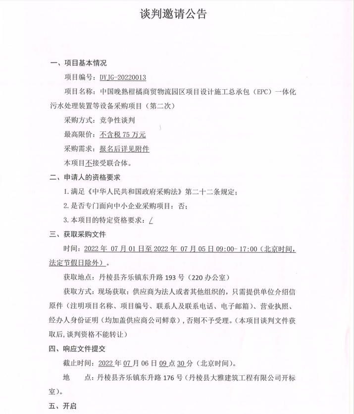 中國晚熟柑橘商貿(mào)物流園區(qū)項目設(shè)計施工總承包(EPC)一體化污水處理裝置等設(shè)備采購項目第二次談判邀請公告