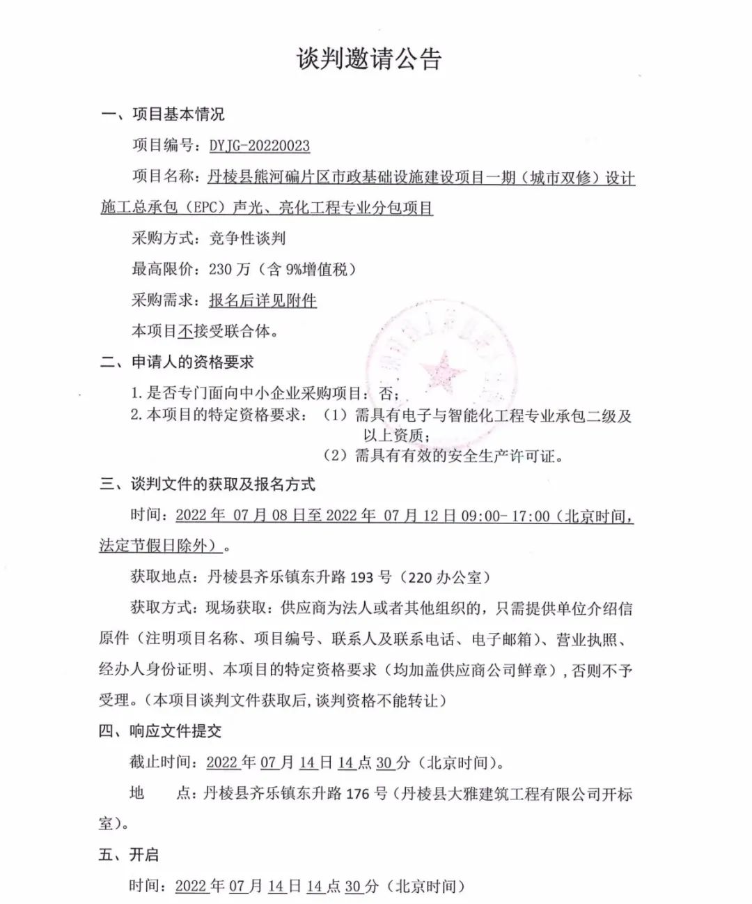 丹棱縣熊河碥片區(qū)市政基礎(chǔ)設(shè)施建設(shè)一期(城市雙修)設(shè)計(jì)施工總承包(EPC)聲光、亮化工程專業(yè)分包項(xiàng)目談判邀請(qǐng)公告