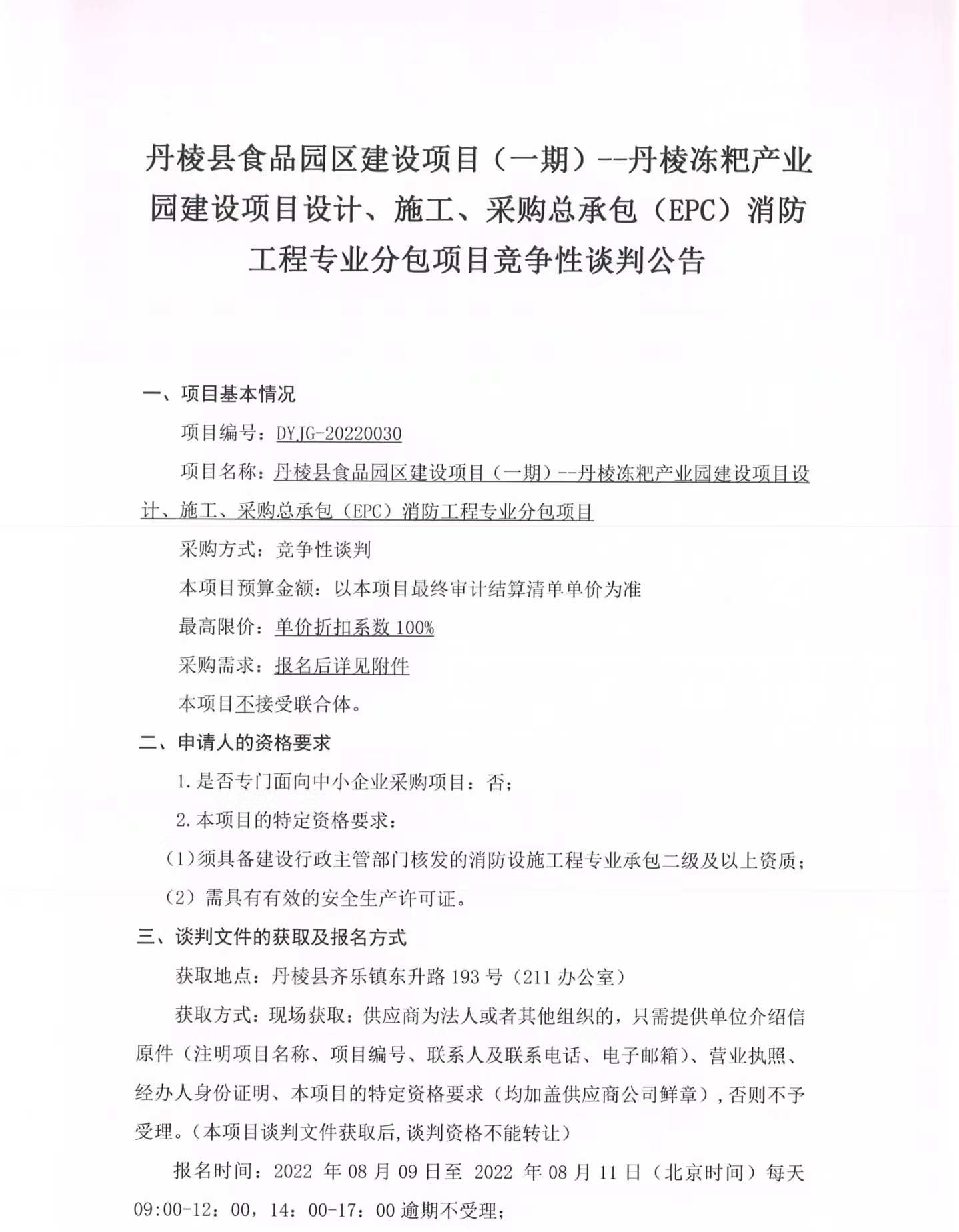 丹棱縣食品園區(qū)建設(shè)項目(一期)--丹棱凍粑產(chǎn)業(yè)園建設(shè)項目設(shè)計、施工、采購總承包(EPC)消防工程專業(yè)分包項目競爭性談判公告