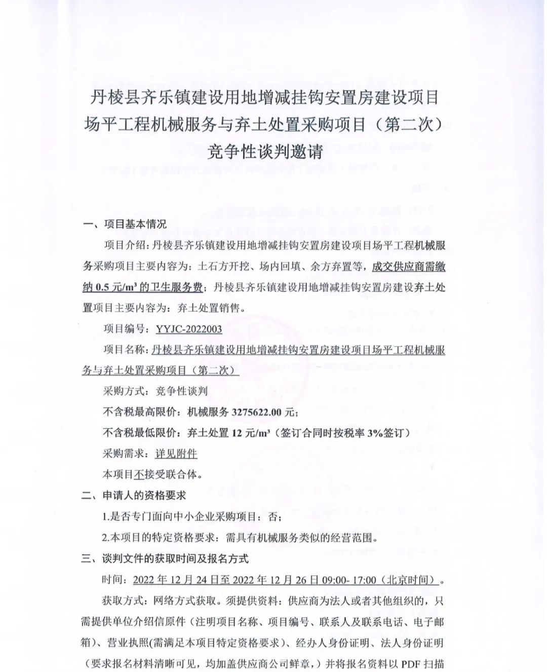 丹棱縣齊樂鎮(zhèn)建設(shè)用地增減掛鉤安置房建設(shè)項(xiàng)目場平工程機(jī)械服務(wù)與棄土處置采購項(xiàng)目(第二次)競爭性談判邀請(qǐng)