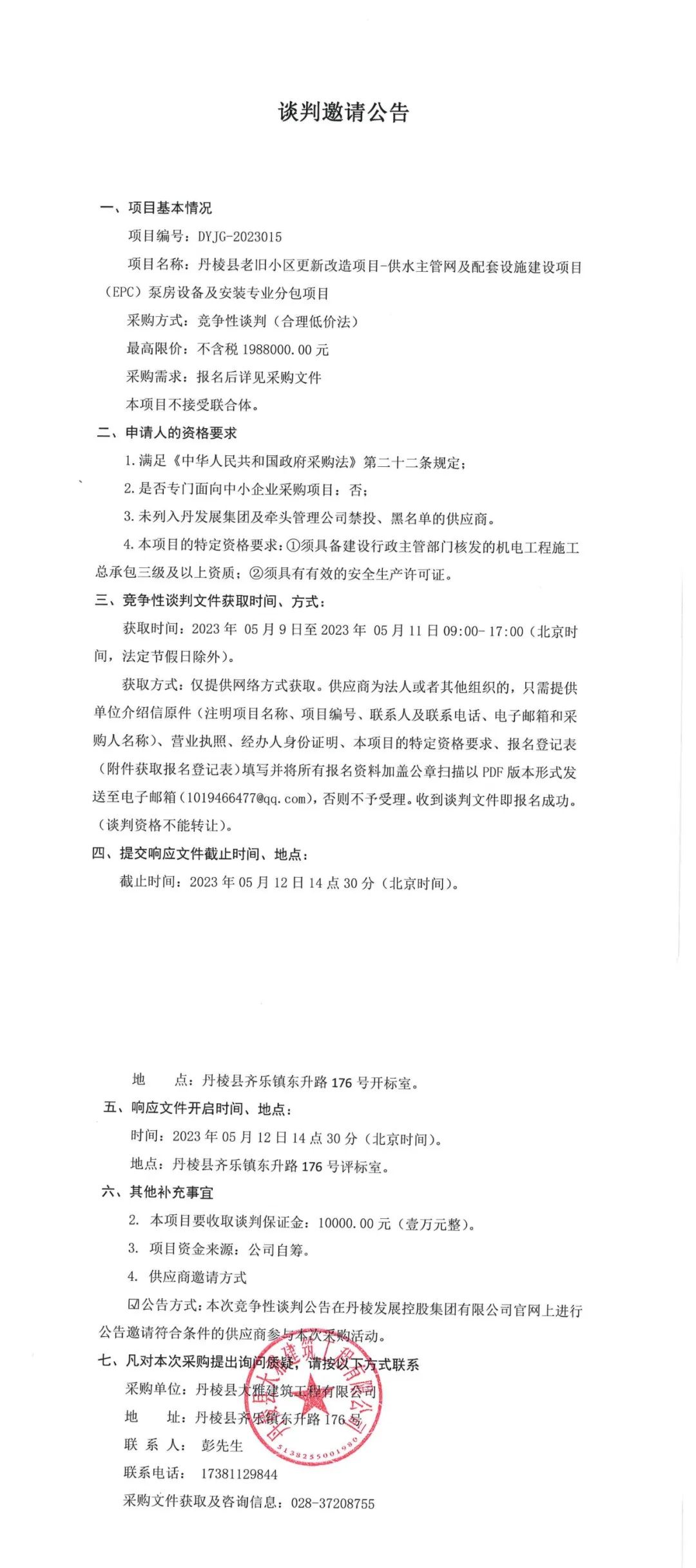 丹棱縣老舊小區(qū)更新改造項目-供水主管網(wǎng)及配套設(shè)施建設(shè)項目(EPC)泵房設(shè)備及安裝專業(yè)分包項目談判邀請公告