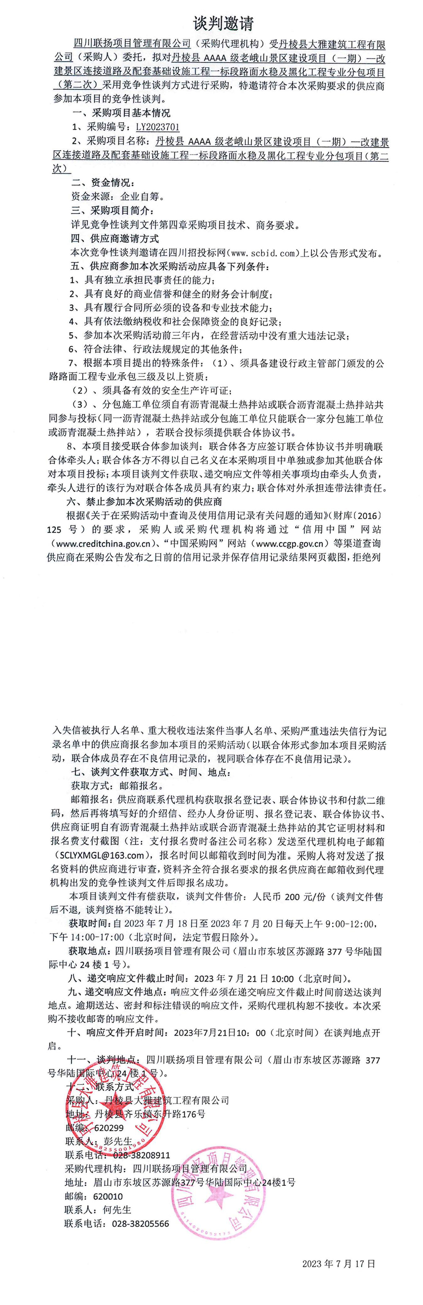 丹棱縣AAAA級(jí)老峨山景區(qū)建設(shè)項(xiàng)目(一期)—改建景區(qū)連接道路及配套基礎(chǔ)設(shè)施工程一標(biāo)段水穩(wěn)及黑化工程專業(yè)分包談判邀請公告(第二次)