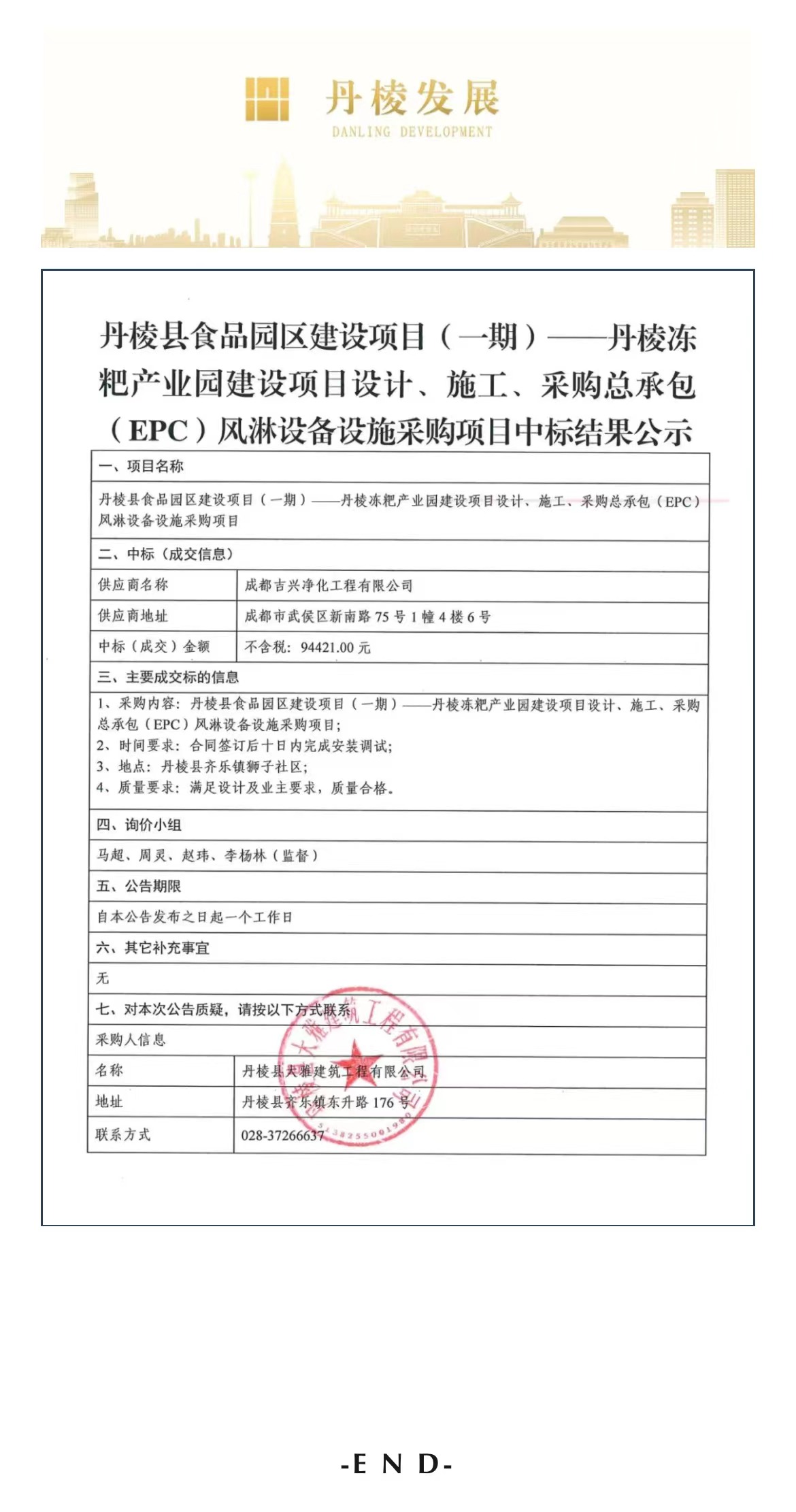 丹棱縣食品園區(qū)建設(shè)項(xiàng)目(一期)—丹棱凍粑產(chǎn)業(yè)園建設(shè)項(xiàng)目設(shè)計(jì)、施工、采購(gòu)總承包(EPC)風(fēng)淋設(shè)備設(shè)施詢價(jià)采購(gòu)項(xiàng)目中標(biāo)結(jié)果公示