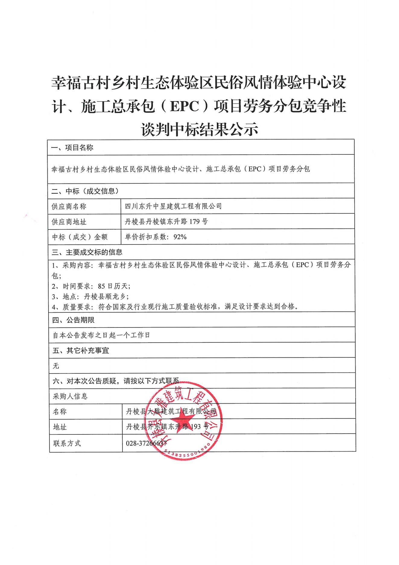 【大雅建筑公司】幸福古村鄉(xiāng)村生態(tài)體驗(yàn)區(qū)民俗風(fēng)情體驗(yàn)中心設(shè)計(jì)、施工總承包(EPC)項(xiàng)目勞務(wù)分包競(jìng)爭(zhēng)性談判中標(biāo)結(jié)果公示