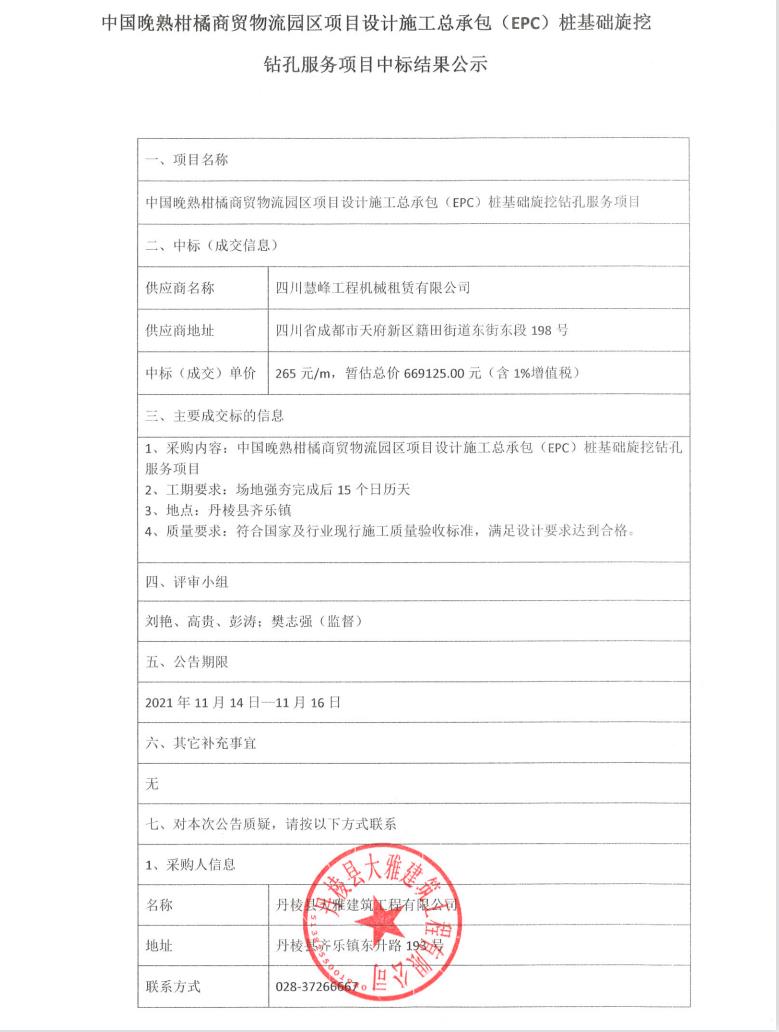 【大雅建筑公司】中國晚熟柑橘商貿(mào)物流園區(qū)項(xiàng)目設(shè)計(jì)施工總承包(EPC)樁基礎(chǔ)旋挖鉆孔服務(wù)項(xiàng)目中標(biāo)結(jié)果公示