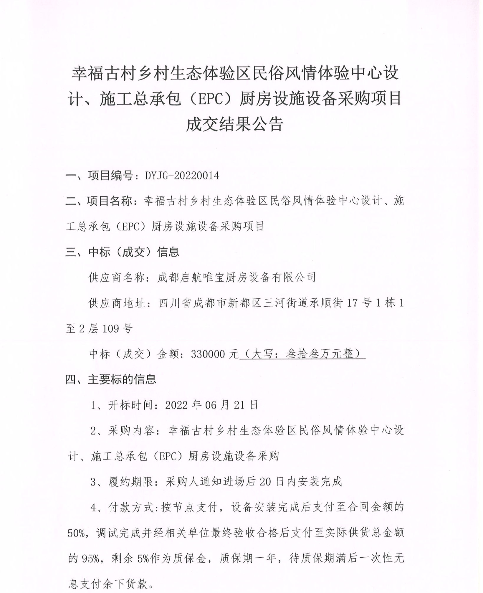 幸福古村鄉(xiāng)村生態(tài)體驗區(qū)民俗風(fēng)情體驗中心設(shè)計、施工總承包(EPC)廚房設(shè)施設(shè)備采購項目成交結(jié)果公告