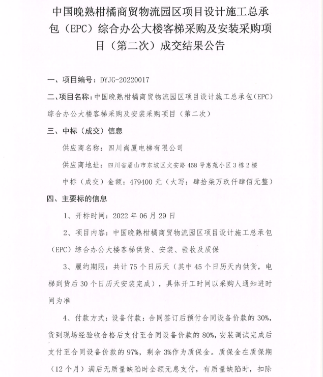 中國(guó)晚熟柑橘商貿(mào)物流園區(qū)項(xiàng)目設(shè)計(jì)施工總承包(EPC)綜合辦公大樓客梯采購及安裝采購項(xiàng)目(第二次)成交結(jié)果公告