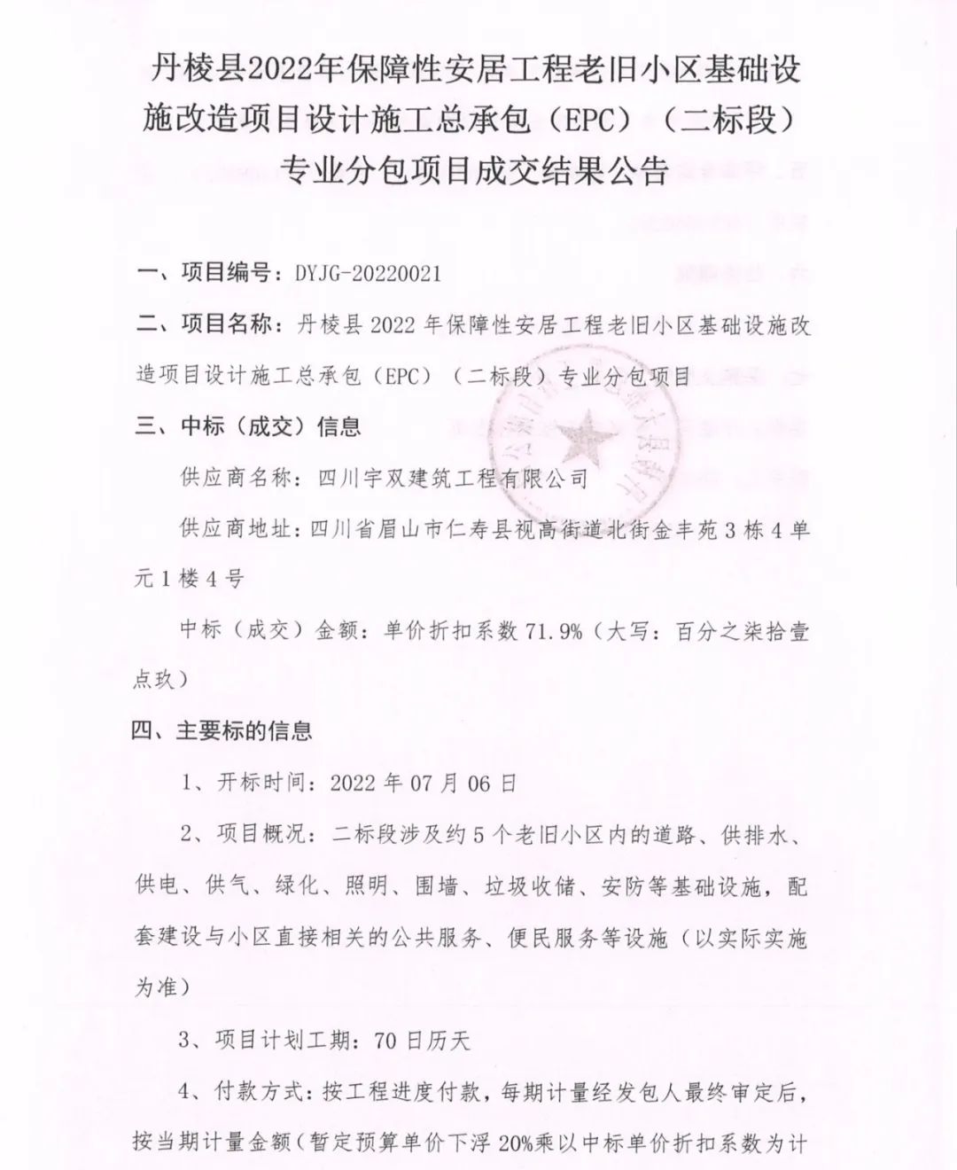 丹棱縣2022年保障性安居工程老舊小區(qū)基礎設施改造項目設計施工總承包(EPC)(二標段)專業(yè)分包項目成交結(jié)果公告