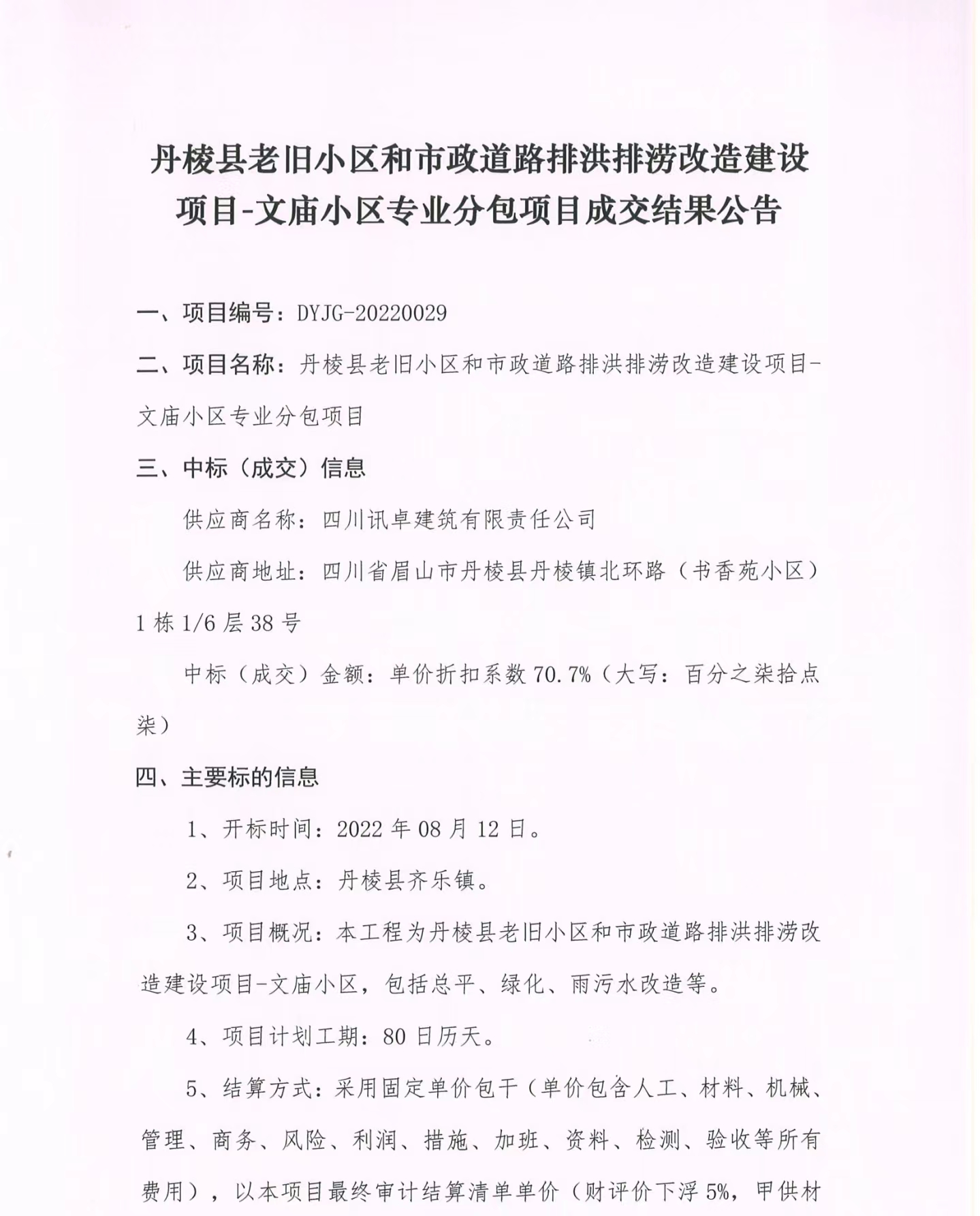 丹棱縣老舊小區(qū)和市政道路排洪排澇改造建設項目-文廟小區(qū)專業(yè)分包項目成交結果公告