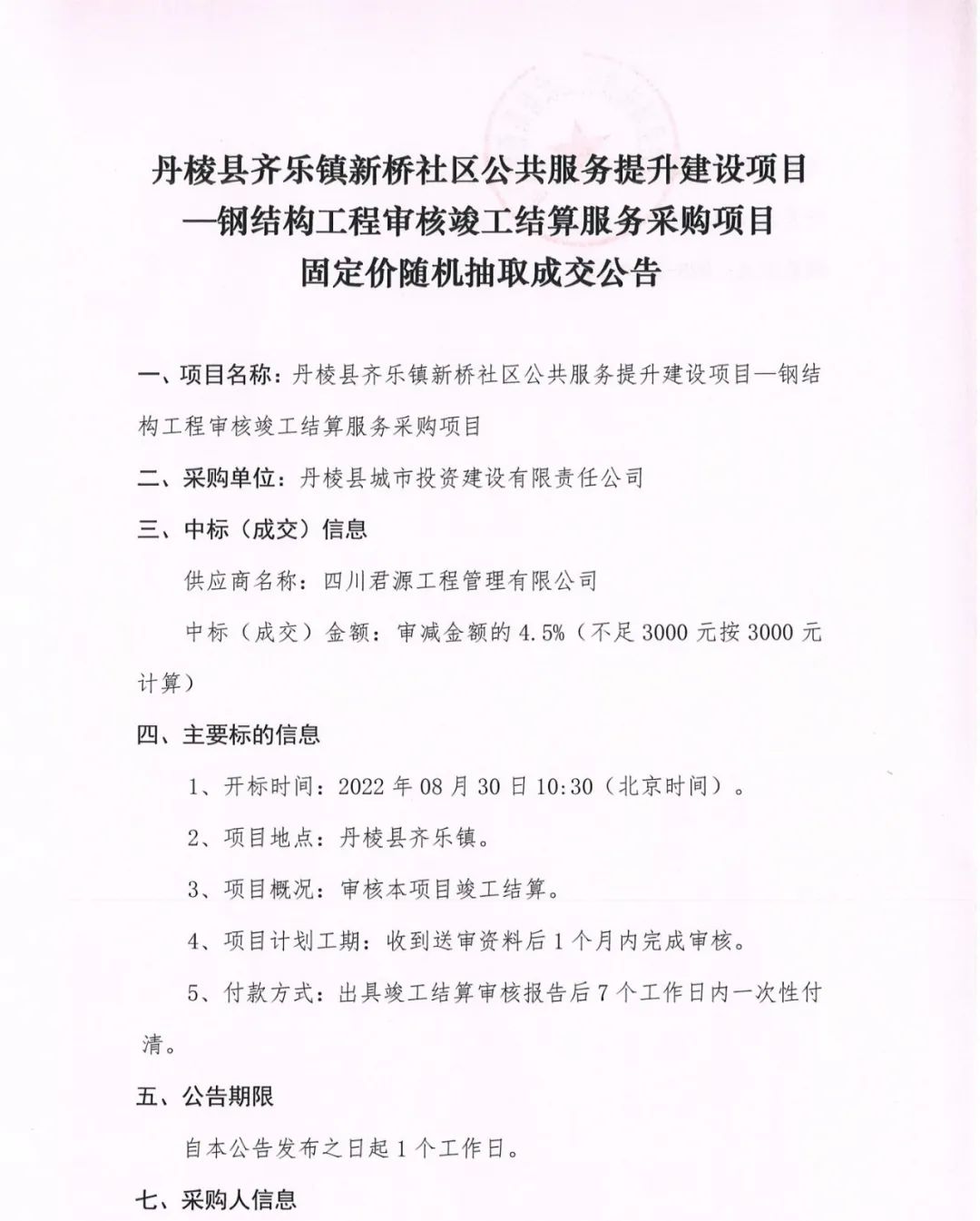 丹棱縣齊樂鎮(zhèn)新橋社區(qū)公共服務(wù)提升建設(shè)項目--鋼結(jié)構(gòu)工程審核竣工結(jié)算服務(wù)采購項目固定價隨機抽取成交公告