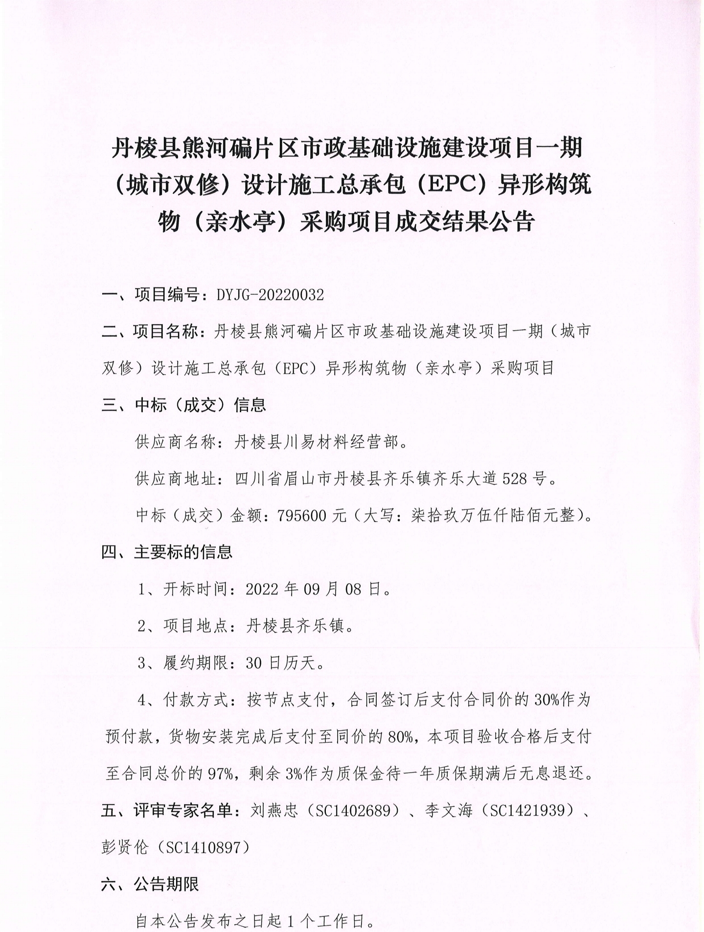 丹棱縣熊河碥片區(qū)市政基礎(chǔ)設(shè)施建設(shè)項(xiàng)目一期(城市雙修)設(shè)計施工總承包(EPC)異形構(gòu)筑物(親水亭)采購項(xiàng)目成交結(jié)果公告