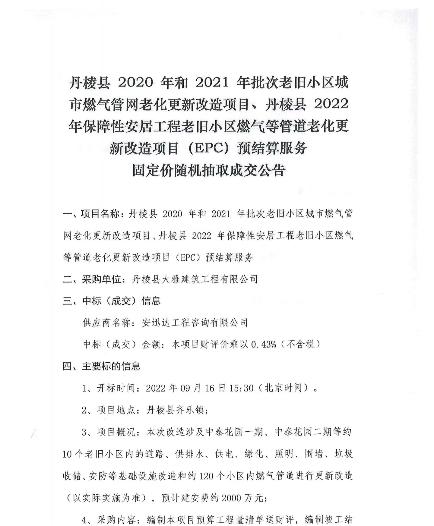 丹棱縣 2020 年、2021年及2022年批次老舊小區(qū)城市燃氣管網(wǎng)老化更新改造項目預結算服務固定價隨機抽取成交公告