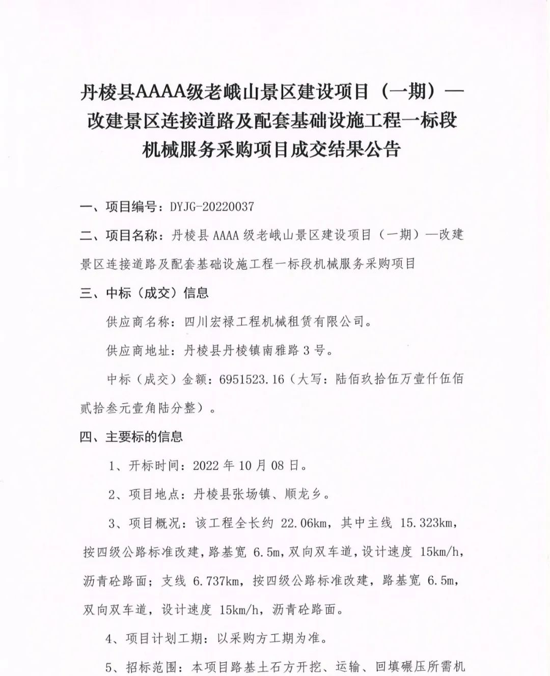 丹棱縣AAAA級(jí)老峨山景區(qū)建設(shè)項(xiàng)目(一期)--改建景區(qū)連接道路及配套基礎(chǔ)設(shè)施工程一標(biāo)段機(jī)械服務(wù)采購項(xiàng)目成交結(jié)果公告