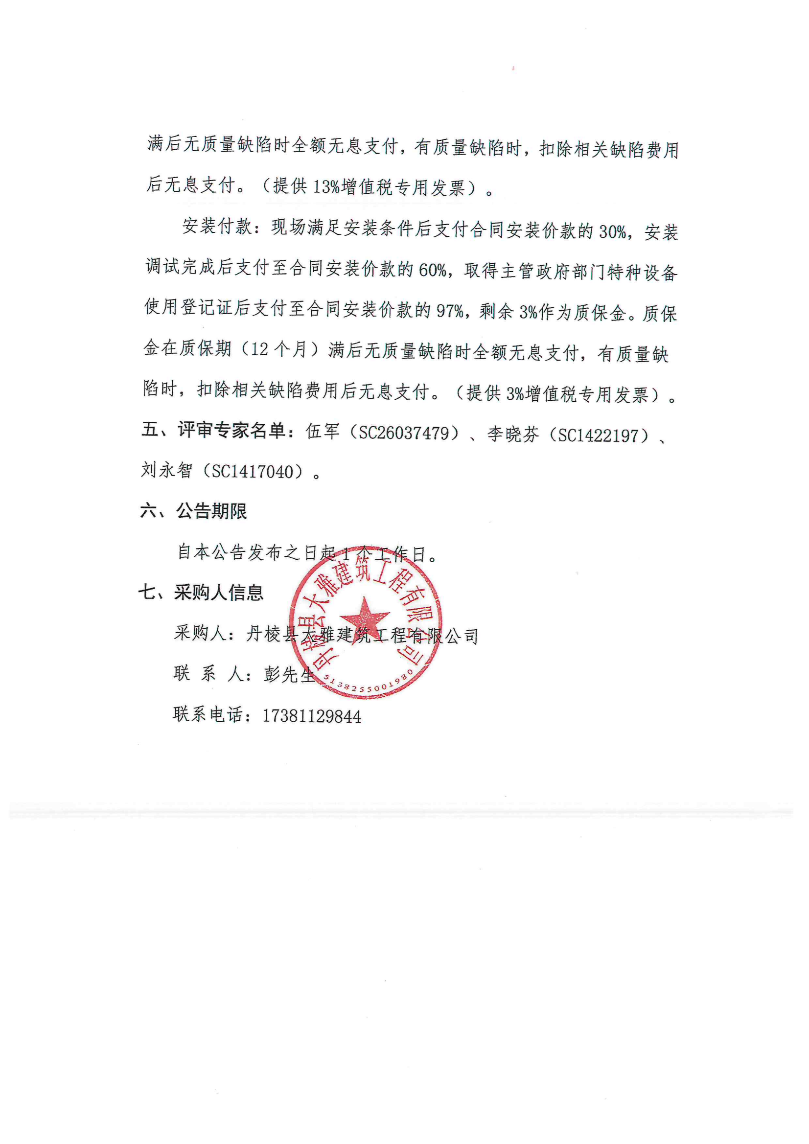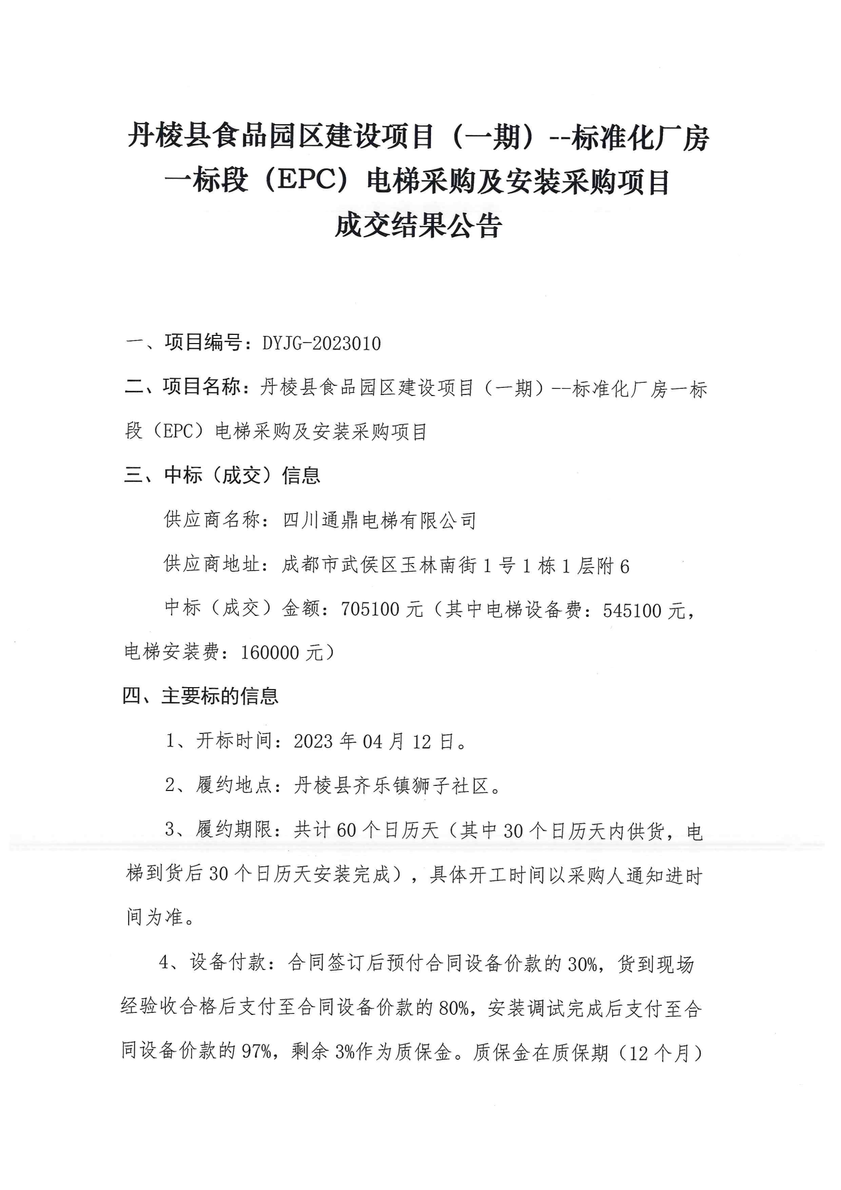 丹棱縣食品園區(qū)建設(shè)項(xiàng)目(一期)--標(biāo)準(zhǔn)化廠房一標(biāo)段(EPC)電梯采購及安裝采購項(xiàng)目成交結(jié)果公告