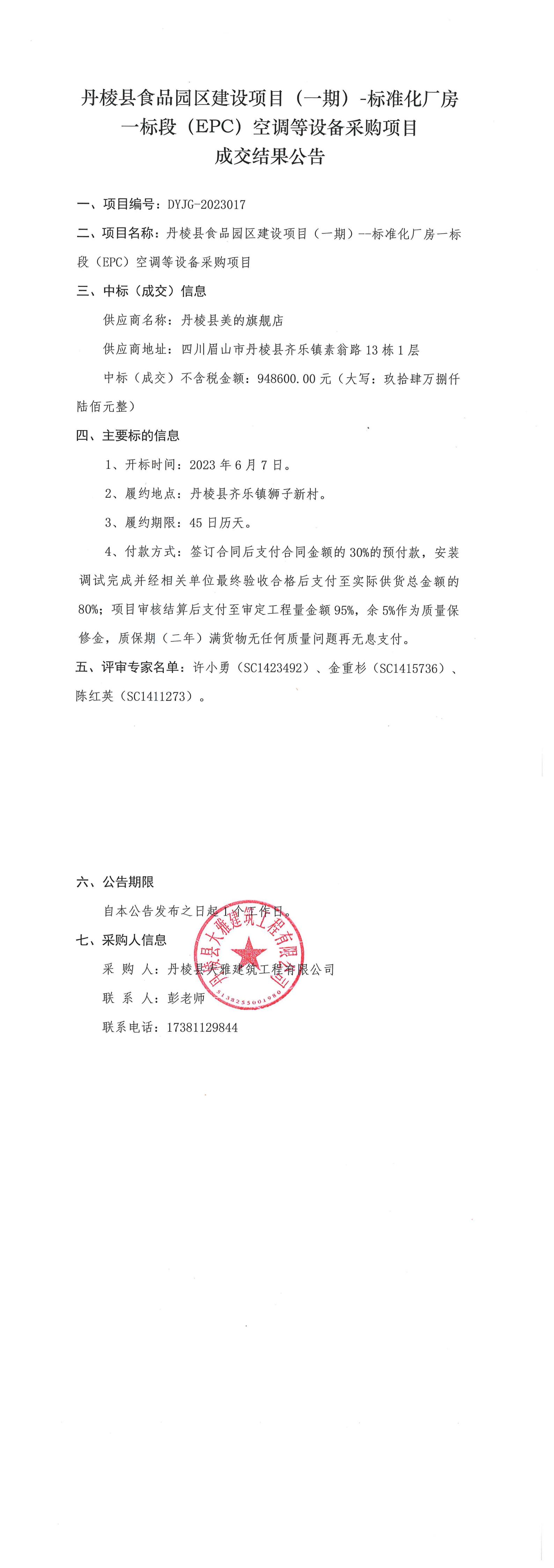 丹棱縣食品園區(qū)建設項目(一期)-標準化廠房一標段(EPC)空調(diào)等設備采購項目成交結果公告