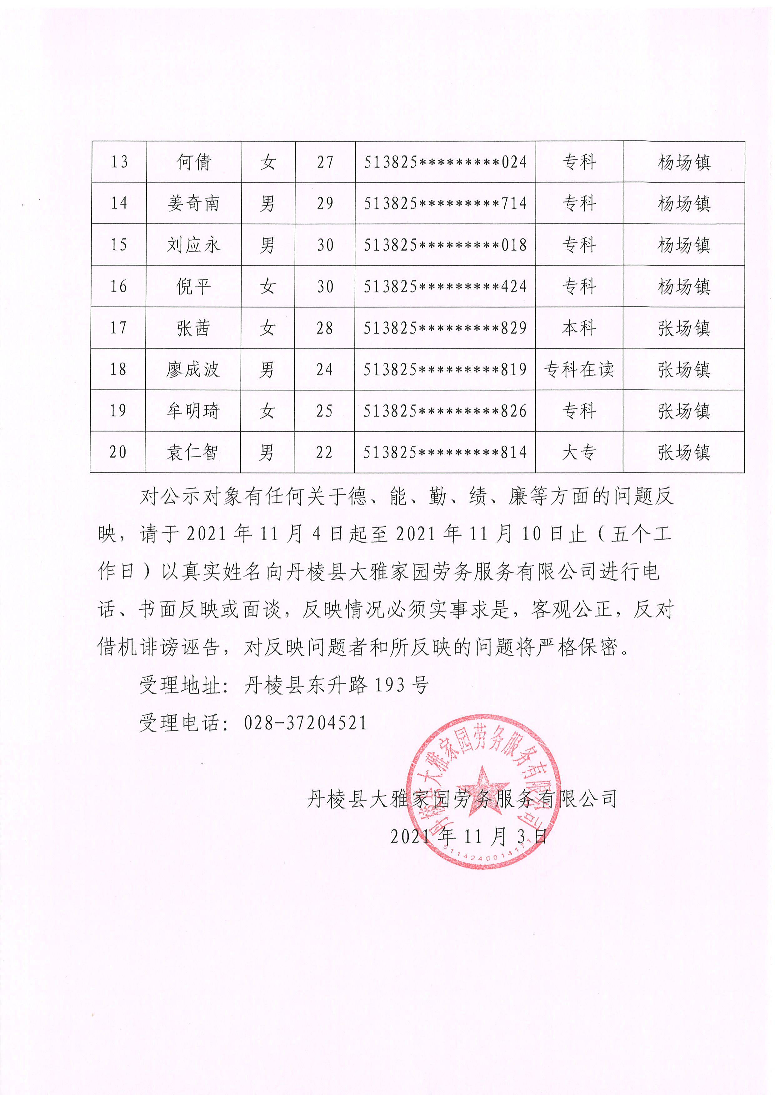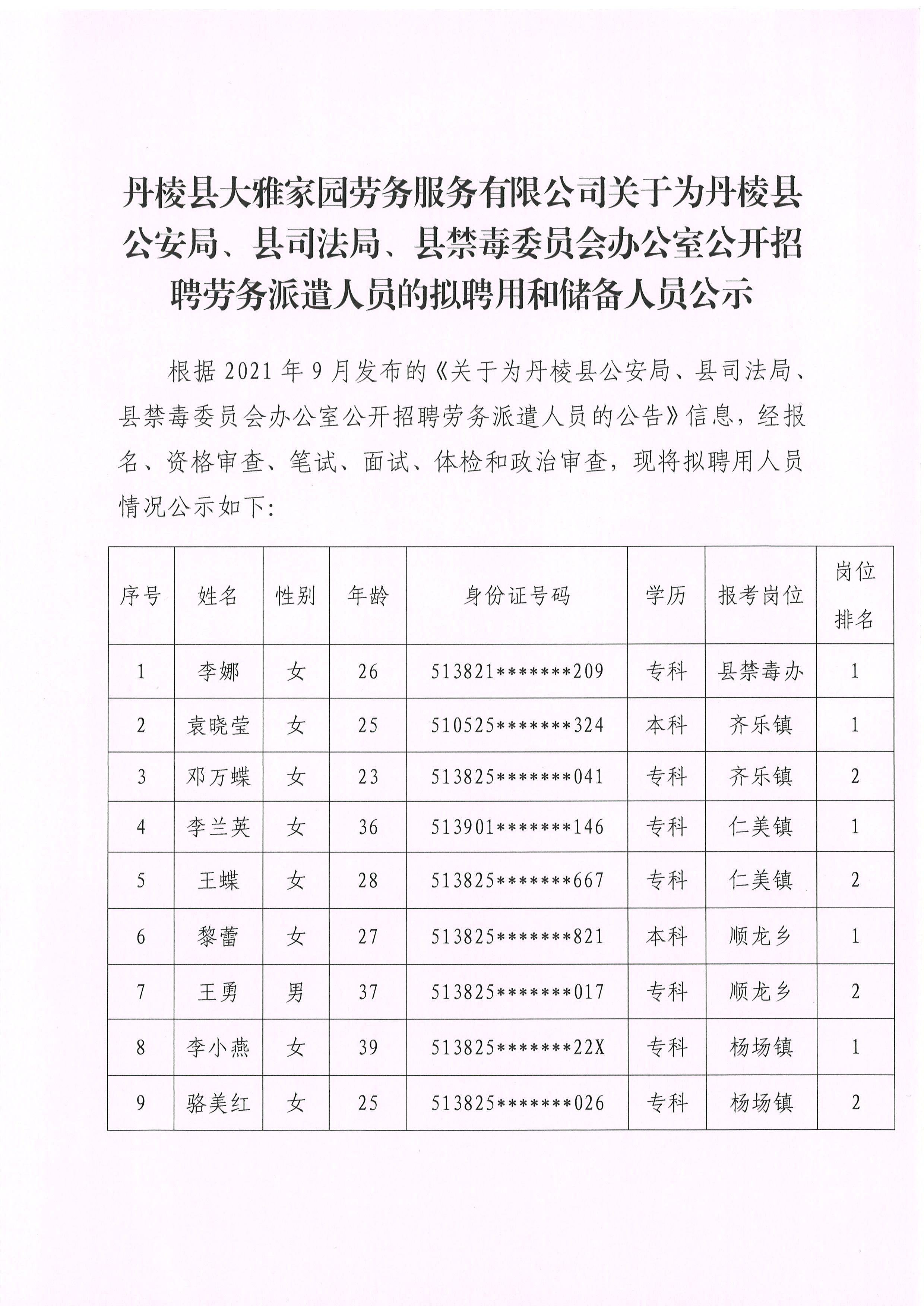 【大雅勞務(wù)公司】丹棱縣大雅家園勞務(wù)服務(wù)有限公司關(guān)于為丹棱縣公安局、縣司法局、縣禁毒委員會辦公室公開招聘勞務(wù)派遣人員的擬聘用和儲備人員公示