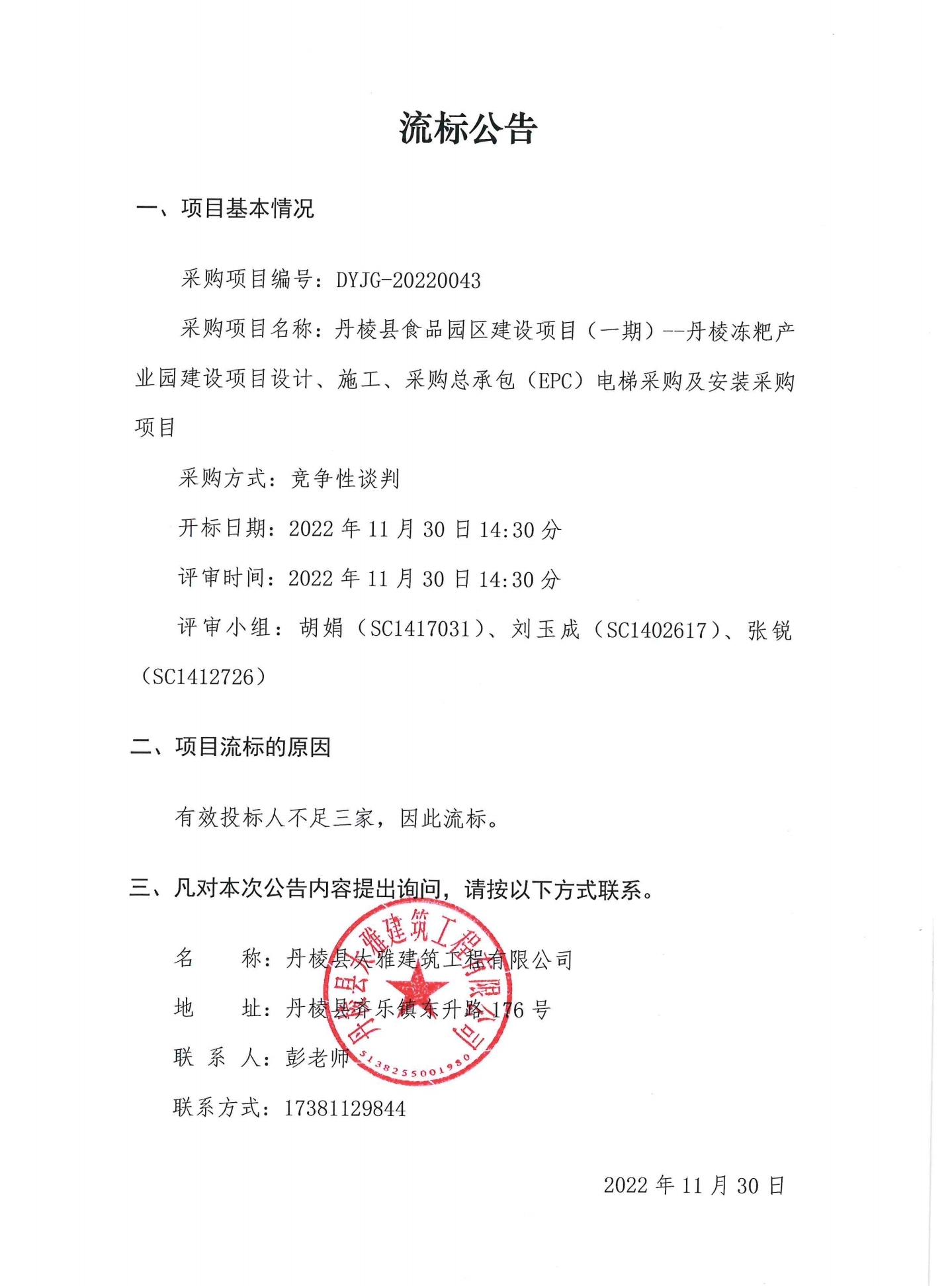 丹棱縣食品園區(qū)建設項目 (一期)--丹棱凍粑產業(yè)園建設項目設計、施工、采購總承包 (EPC) 電梯采購及安裝采購項目流標公告