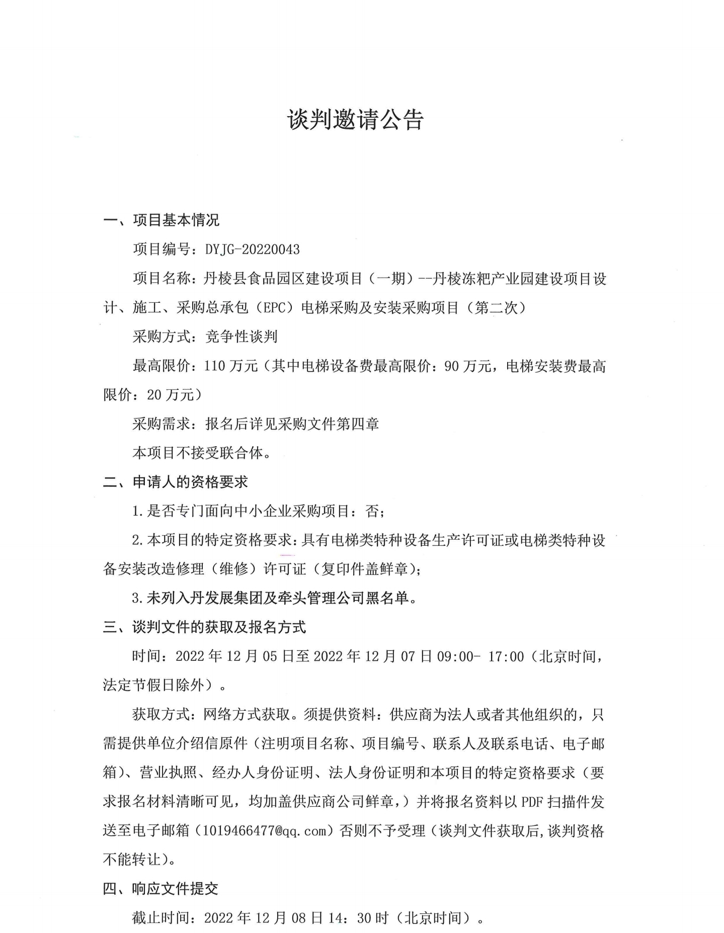 丹棱縣食品園區(qū)建設項目 (一期)--丹樓凍把產(chǎn)業(yè)園建設項目設計、施工、采購總承包 (EPC) 電梯采購及安裝采購項目 (第二次)談判邀請公告