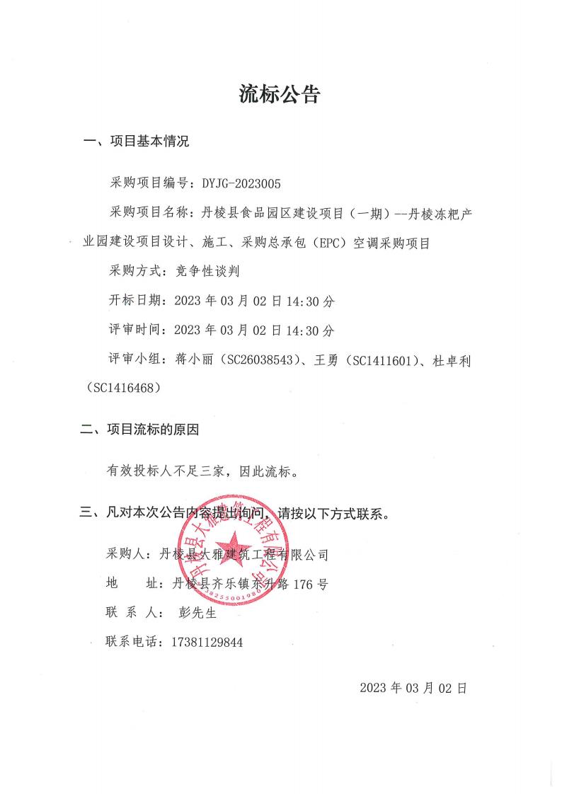 丹棱縣食品園區(qū)建設(shè)項(xiàng)目(一期)--丹棱凍粑產(chǎn)業(yè)園建設(shè)項(xiàng)目設(shè)計(jì)、施工、采購總承包(EPC)空調(diào)采購項(xiàng)目流標(biāo)公告