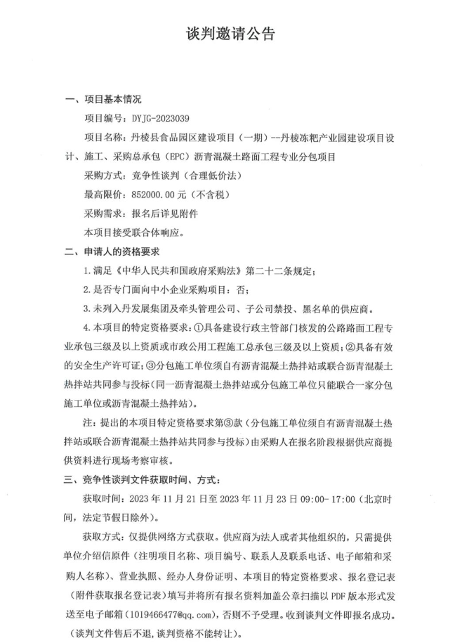 丹棱縣食品園區(qū)建設(shè)項目(一期)—丹棱凍粑產(chǎn)業(yè)園建設(shè)項目設(shè)計、施工、采購總承包(EPC)瀝青混凝土路面工程專業(yè)分包項目談判邀請公告