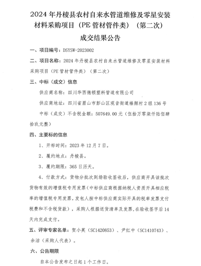 2024年丹棱縣農(nóng)村自來水管道維修及零星安裝材料采購項目(PE管材管件類)(第二次)成交結(jié)果公告