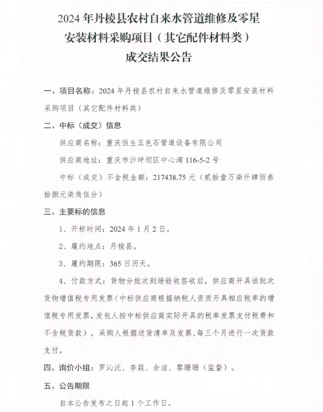 2024年丹棱縣農(nóng)村自來水管道維修及零星安裝材料采購項(xiàng)目 (其它配件材料類 )成交結(jié)果公告