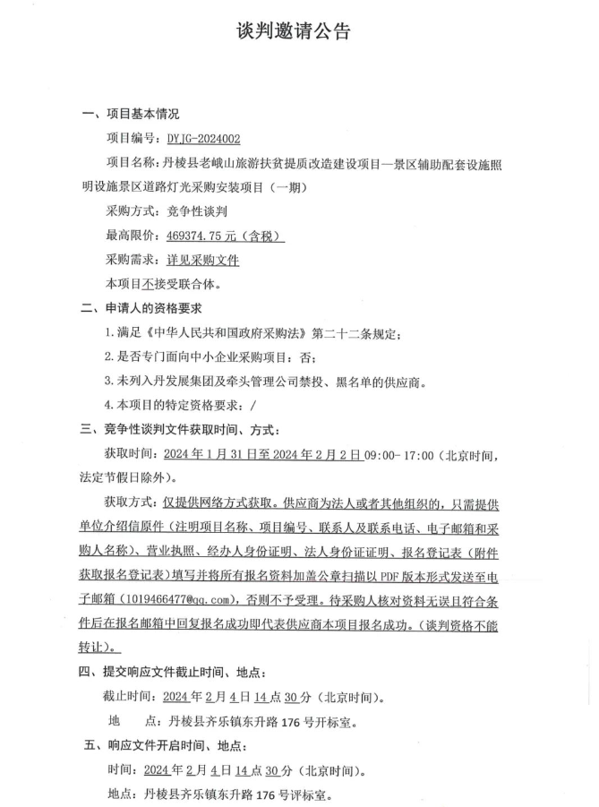 丹棱縣老峨山旅游扶貧提質(zhì)改造建設(shè)項目——景區(qū)輔助配套設(shè)施照明設(shè)施景區(qū)道路燈光采購安裝項目(一期)談判邀請公告