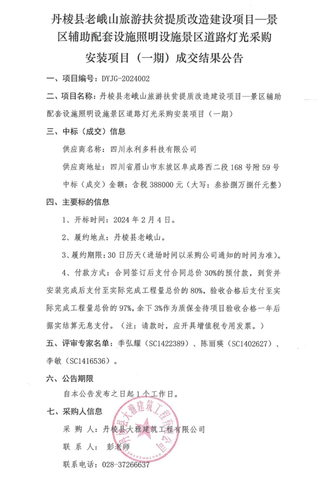 丹棱縣老峨山旅游扶貧提質改造建設項目—景區(qū)輔助配套設施照明設施景區(qū)道路燈光采購安裝項目(一期)成交結果公告