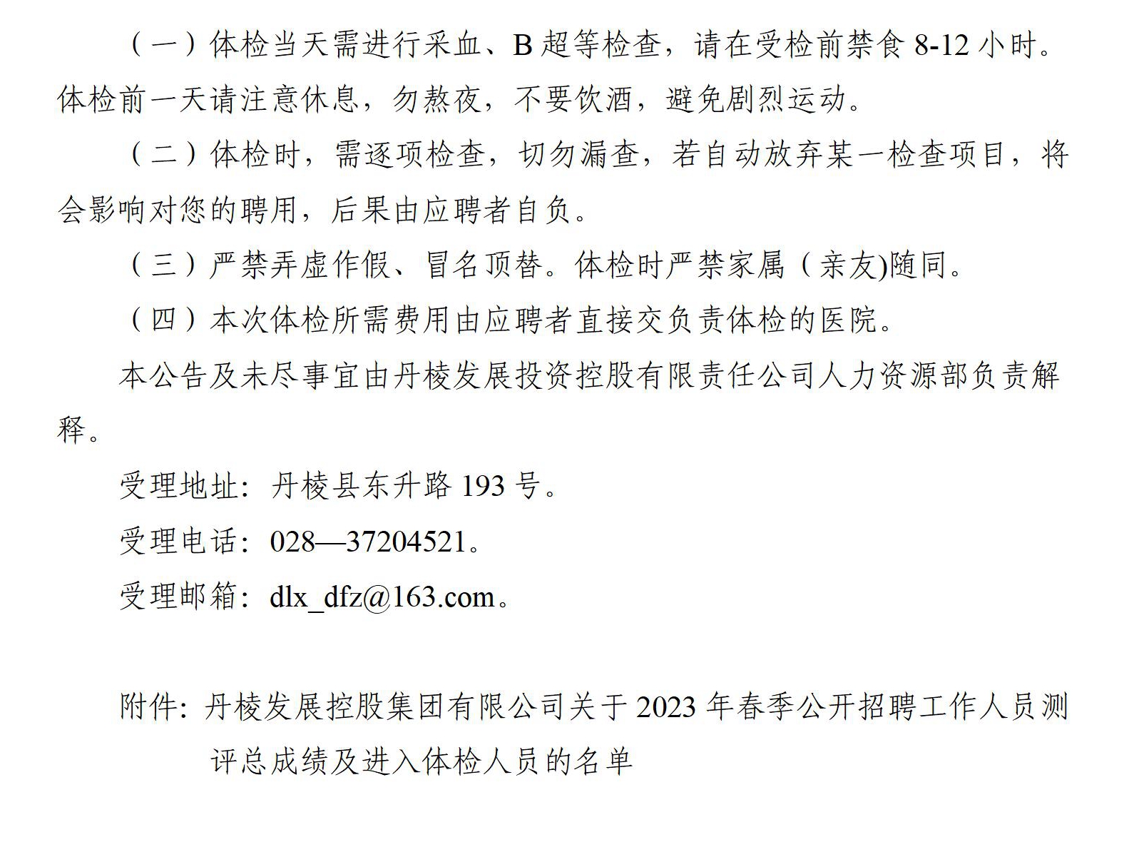 丹棱發(fā)展控股集團(tuán)有限公司關(guān)于2023年春季公開(kāi)招聘工作人員測(cè)評(píng)總成績(jī)及進(jìn)入體檢人員的公告