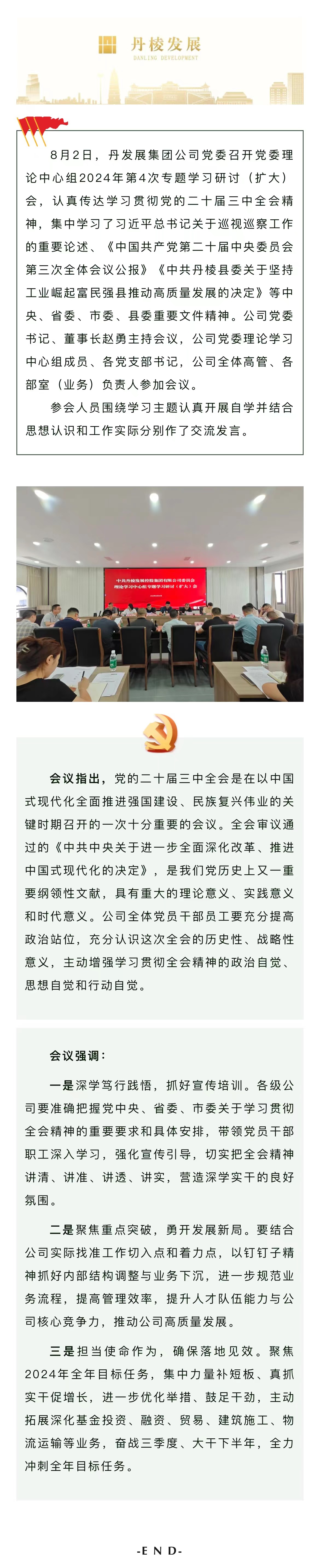 丹發(fā)展集團(tuán)公司黨委理論學(xué)習(xí)中心組召開2024年第4次專題學(xué)習(xí)研討(擴(kuò)大)會(huì)