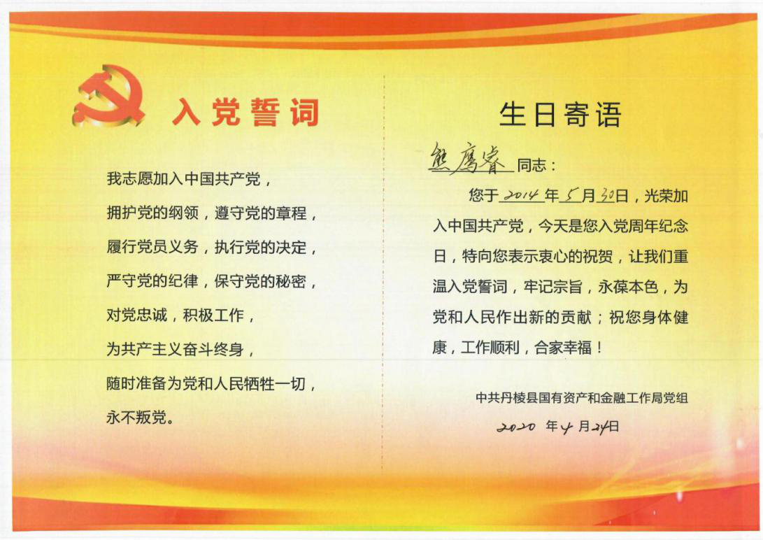 工作安排后,縣國(guó)資金融局黨組集體為5月入黨黨員過(guò)政治生日,縣國(guó)資金融局(縣金融服務(wù)中心)副主任茍永慶同志為“過(guò)生日”的黨員們送上精心制作的“黨員政治生日卡”,勉勵(lì)黨員同志要“常思入黨初衷、銘記入黨誓詞、牢記黨員義務(wù)”,發(fā)揮黨員先鋒模范作用,在今后的工作中不斷創(chuàng)先爭(zhēng)優(yōu),做好表率。活動(dòng)最后,全體黨員同志在縣國(guó)資金融局黨組成員、副局長(zhǎng)潘國(guó)榮同志的帶領(lǐng)下重溫入黨誓詞、面對(duì)黨旗莊嚴(yán)宣誓。